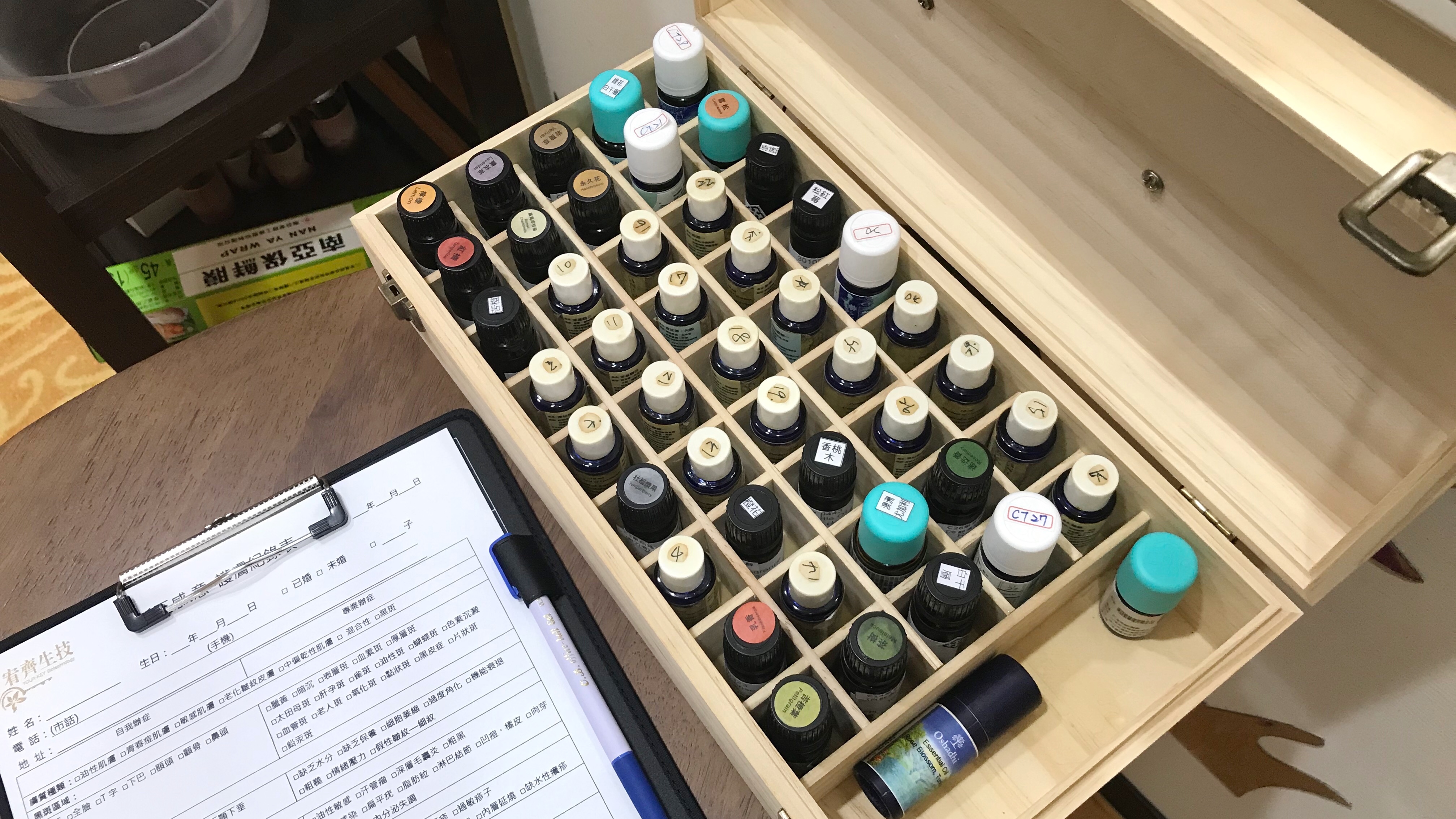 覺得很特別的是挑選課程使用中的精油,像小朋友抓周一樣的盲抽,簡稱叫精油抓周。
