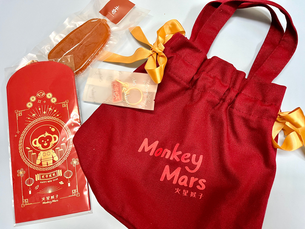 餅乾的好吃程度不在話下,最特別的是春節禮盒中的福虎招財納福包!!紅色的小拉繩包有兩面圖案設計,一面是火星猴子的中英文名稱,另一面是logo