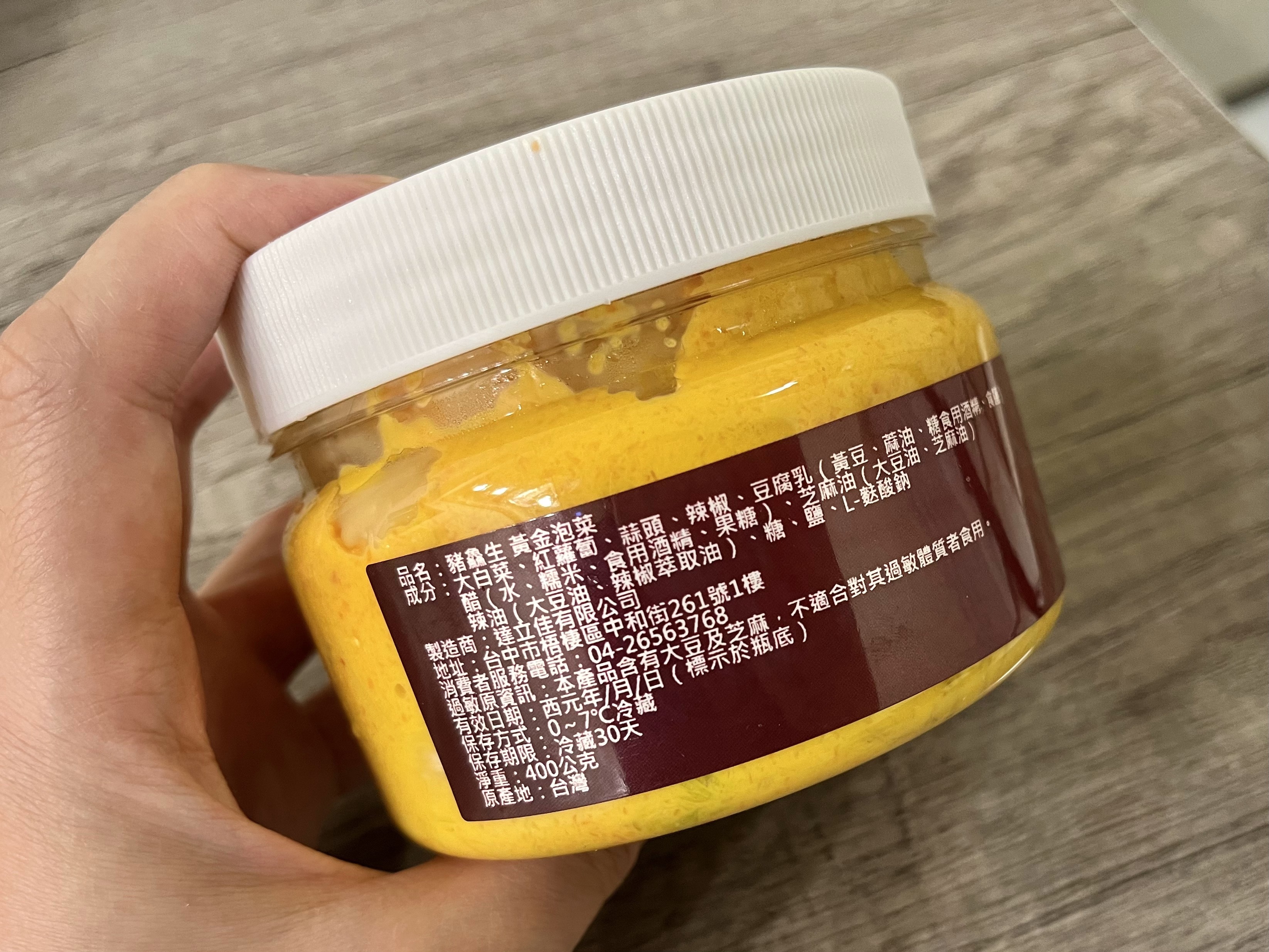每罐包裝都有中文標示及熱量表,常見的「L-麩酸鈉」俗稱味精,是屬於調味劑的一種,不是有的沒的添加物。也因為老闆沒有添加防腐劑,所以保存期限只有一個月,開封後就要盡快享用,每餐都搭配一點🤣很快就吃光惹!